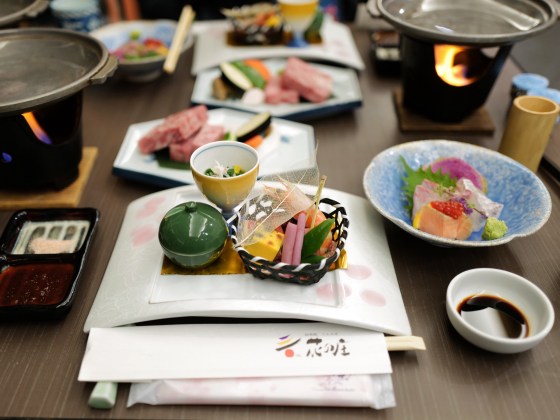 訂了山莊無量塔的一泊二食方案,晚餐在住客限定的餐廳「茶寮 柴扉洞」享用,行前飯店就以email