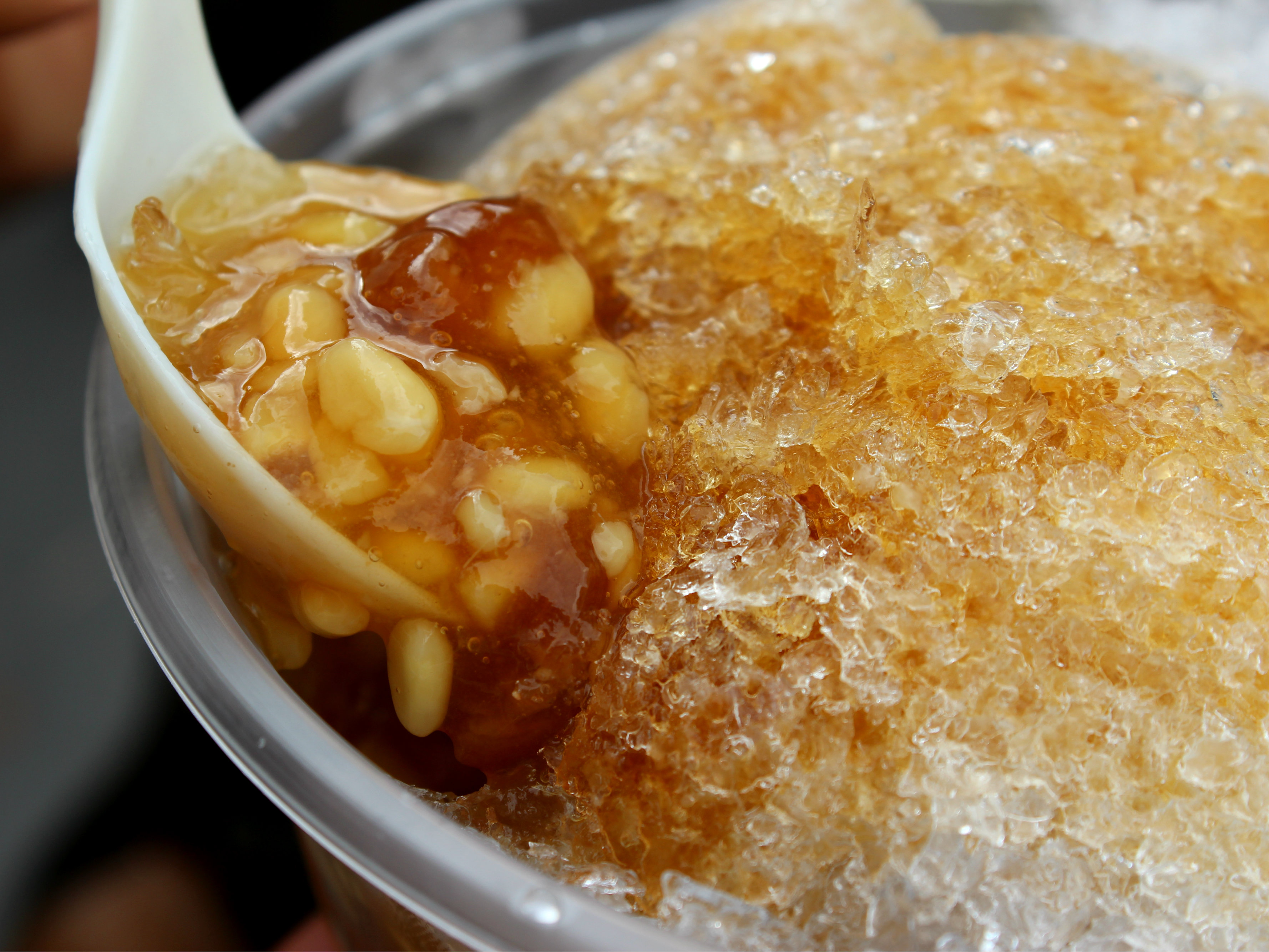 之前沒有吃過綠豆蒜所以無從比較,柯記的原味冰綠豆蒜把熱綠豆蒜蓋上剉冰再淋上黑糖漿,不攪拌直接吃可以感受冷熱層次,攪拌之後就是帶有碎冰的冰綠豆蒜,