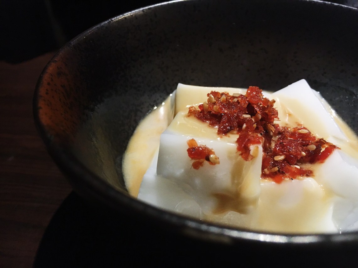 胡麻醬偏稀口味清淡,豆腐的口感像杏仁豆腐,上面灑了像是細碎豆棗的東西和白芝麻,