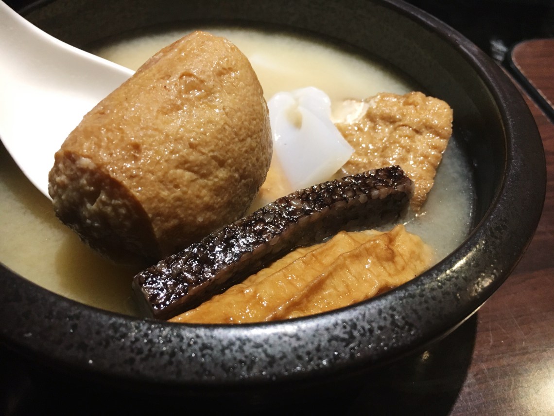 裡頭的湯料有豆皮包絞肉、蒟蒻、油豆腐、竹輪和米血,自己覺得味噌湯的口味和選料都滿不匠氣、有溫暖的手作感(完全是沒有根據的直覺),特別是竹輪,咬起來很紮實,