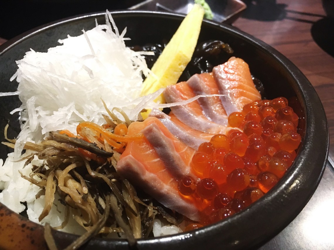 三種食事都是丼飯的模樣,熱騰騰的白飯上鋪了主菜和數種配菜,沒有吃到這個但鮭魚和魚卵看起來都很棒(哪個鮭魚看起來不棒)