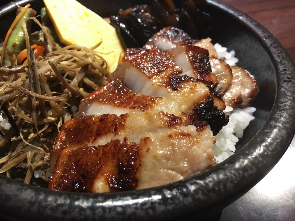 主角鹽烤豬五花長得一副典型「我很美味」的樣子,肥肉比瘦肉約1:5,外面有層嚼勁的豬皮,烤得微焦,鹹香油脆十分下飯,是店內第二熱門的餐點,