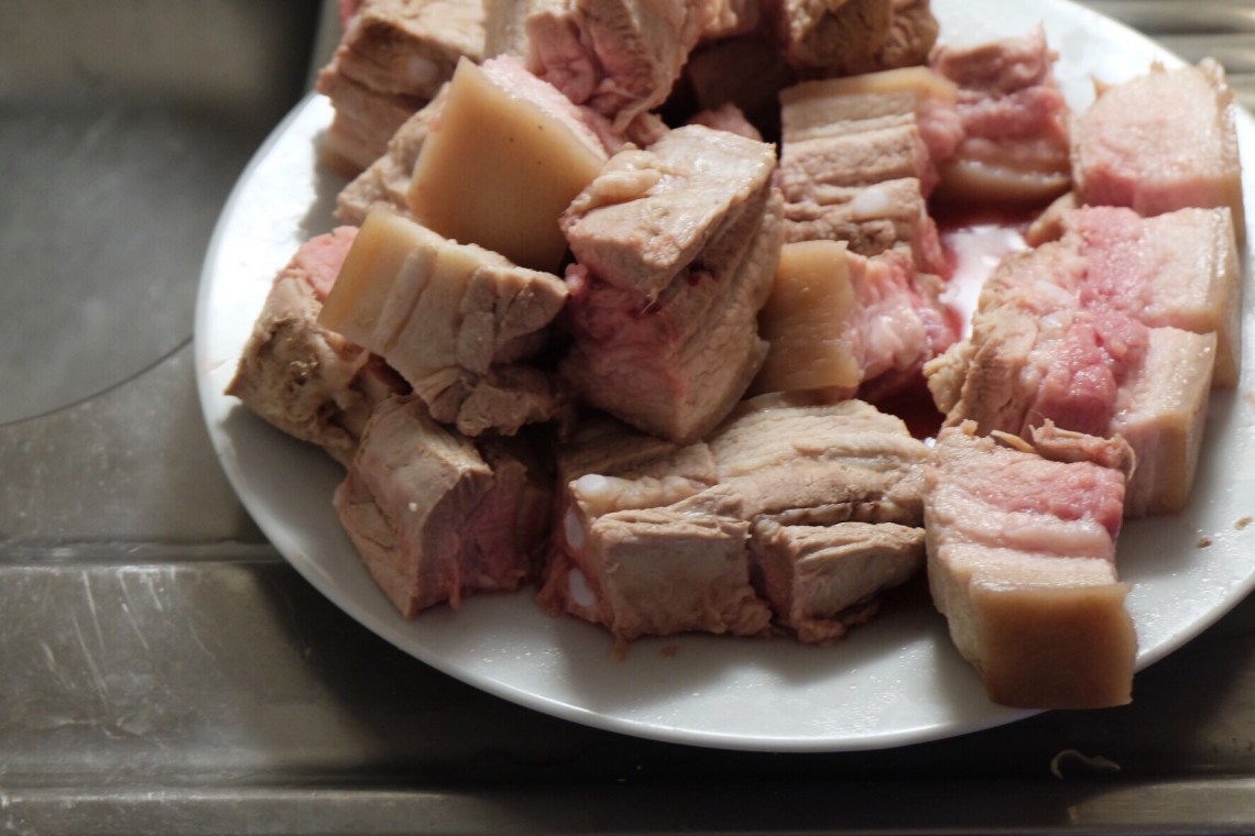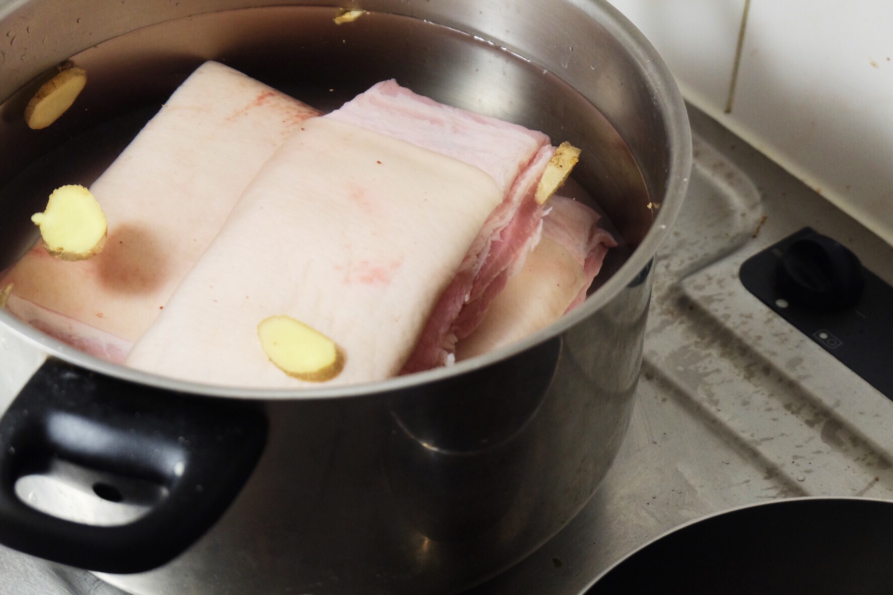 1. 五花肉川燙至水滾,去除雜質(為了加強去腥效果所以加了薑片)