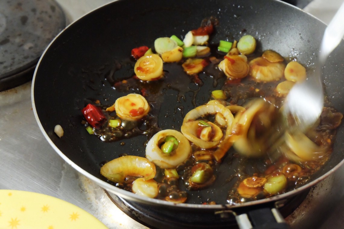 香氣出來後倒入少許醬油、豆瓣醬、味霖、蠔油翻炒。