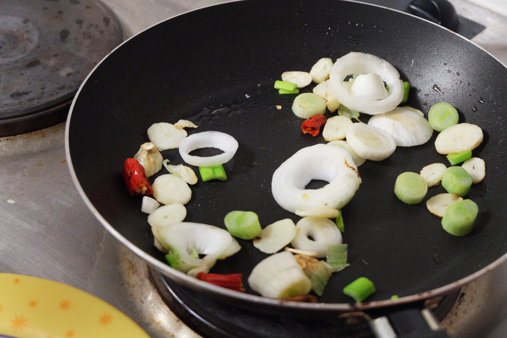 4. 將爆香過的香料和蔥綠、辣椒一起放進鍋中,倒入1:1的水和醬油,再視個人口味加入糖,
