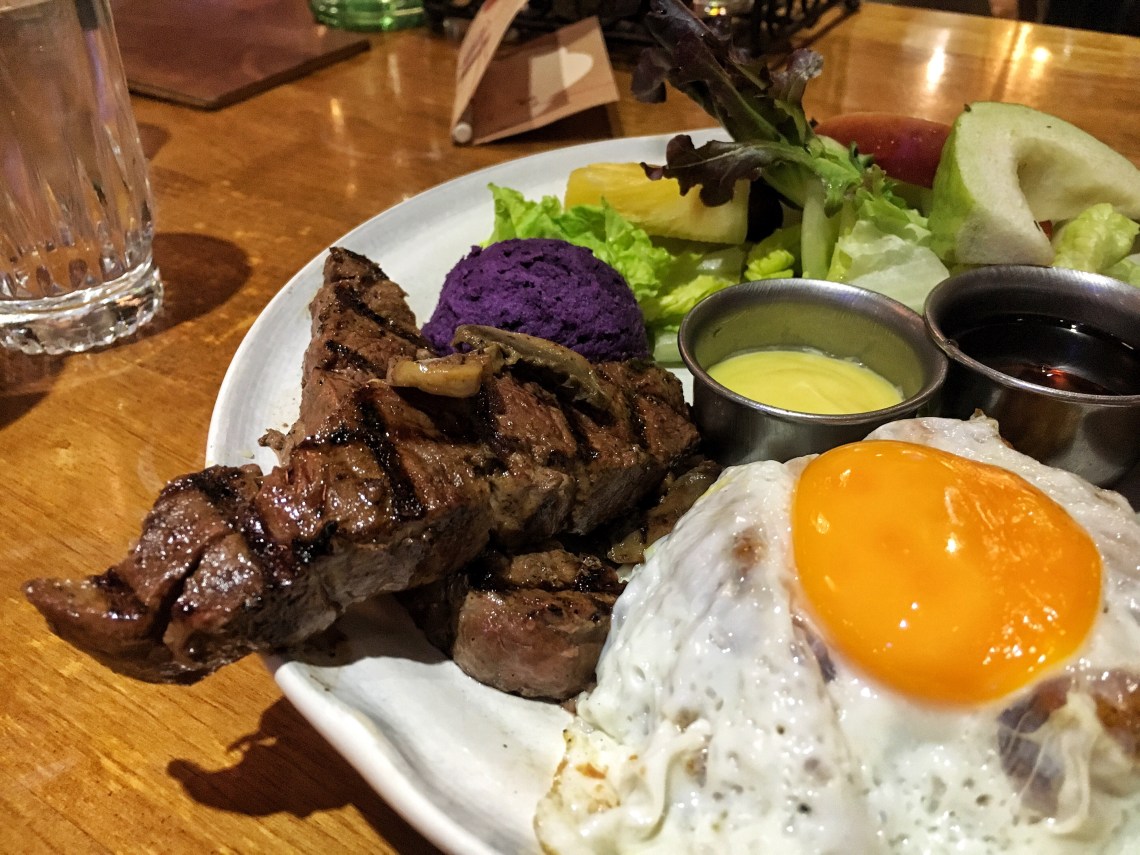 配菜有調味自然的紫薯泥、水果沙拉、半熟太陽蛋、薯角,沙拉醬與蜂蜜,