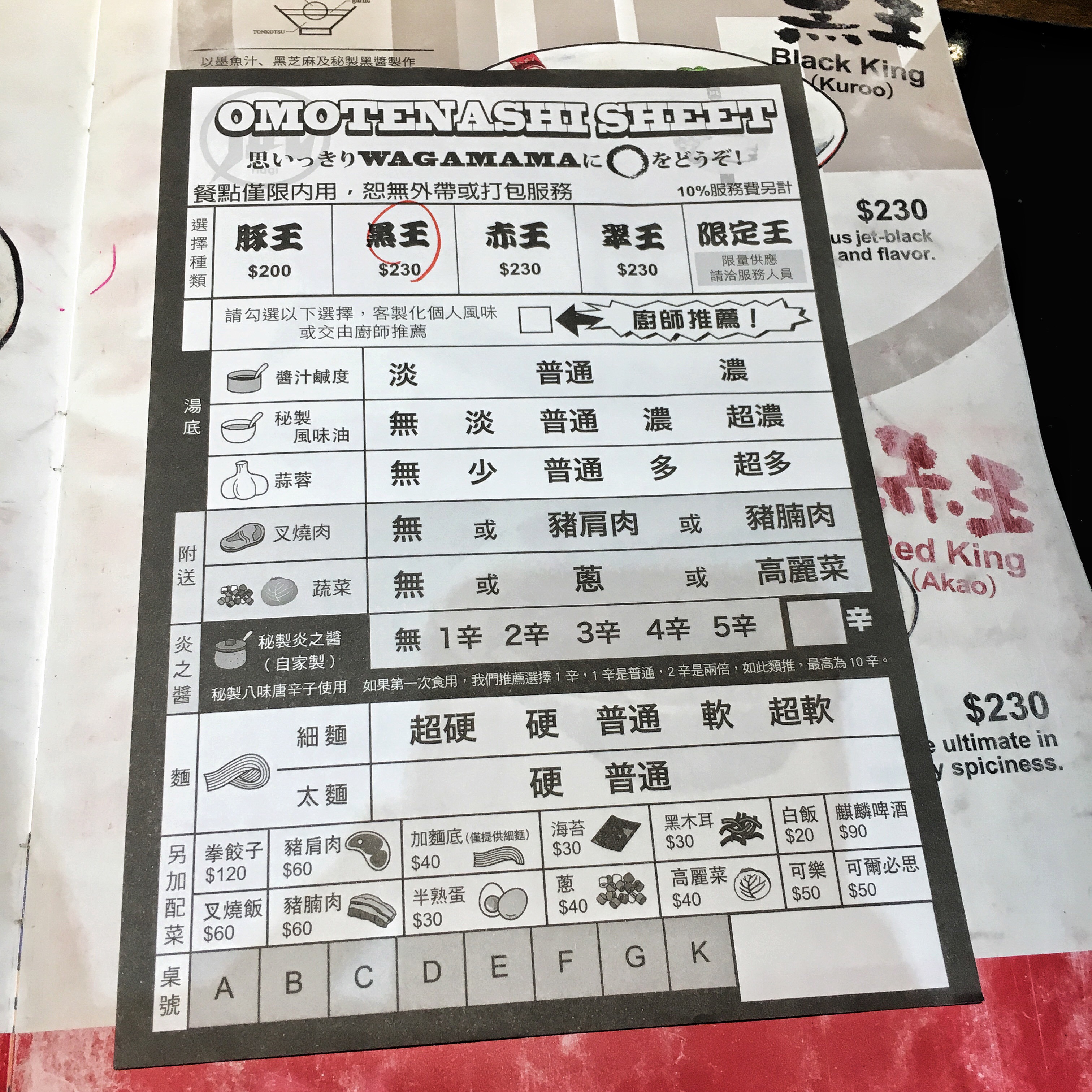 一入座會被發下omotenashi sheet(?)可以選擇拉麵種類、湯底、叉燒、蔬菜、辣醬、麵的軟硬及是否添加配菜,