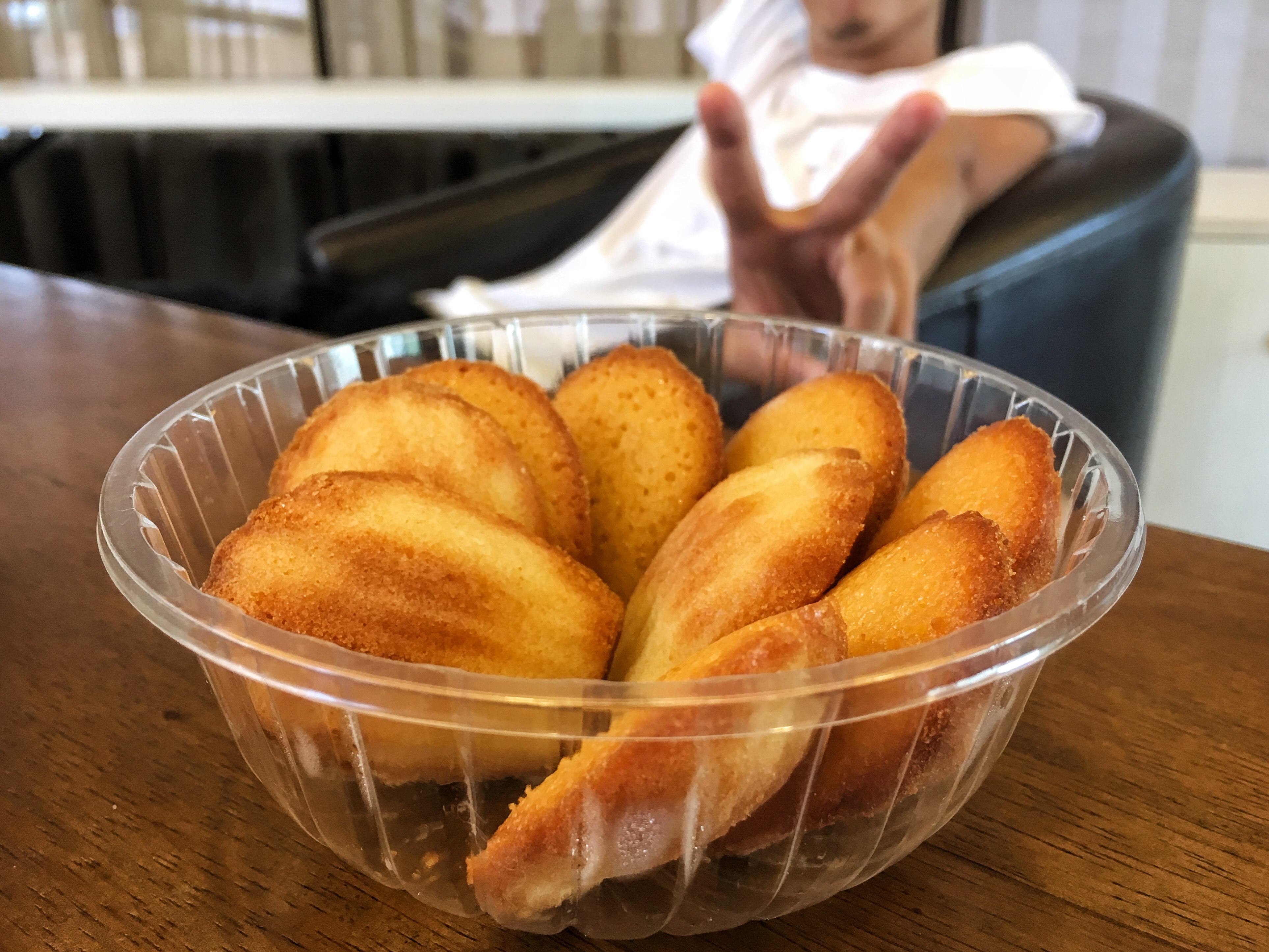想起在法國時各個超市也都找得到這項經典的法國點心,有原味、巧克力、原味混巧克力豆,而麵包店賣的則多有柑橘或杏仁香氣,離法長途旅遊前有時會買幾包作為旅途中的早餐或點心
