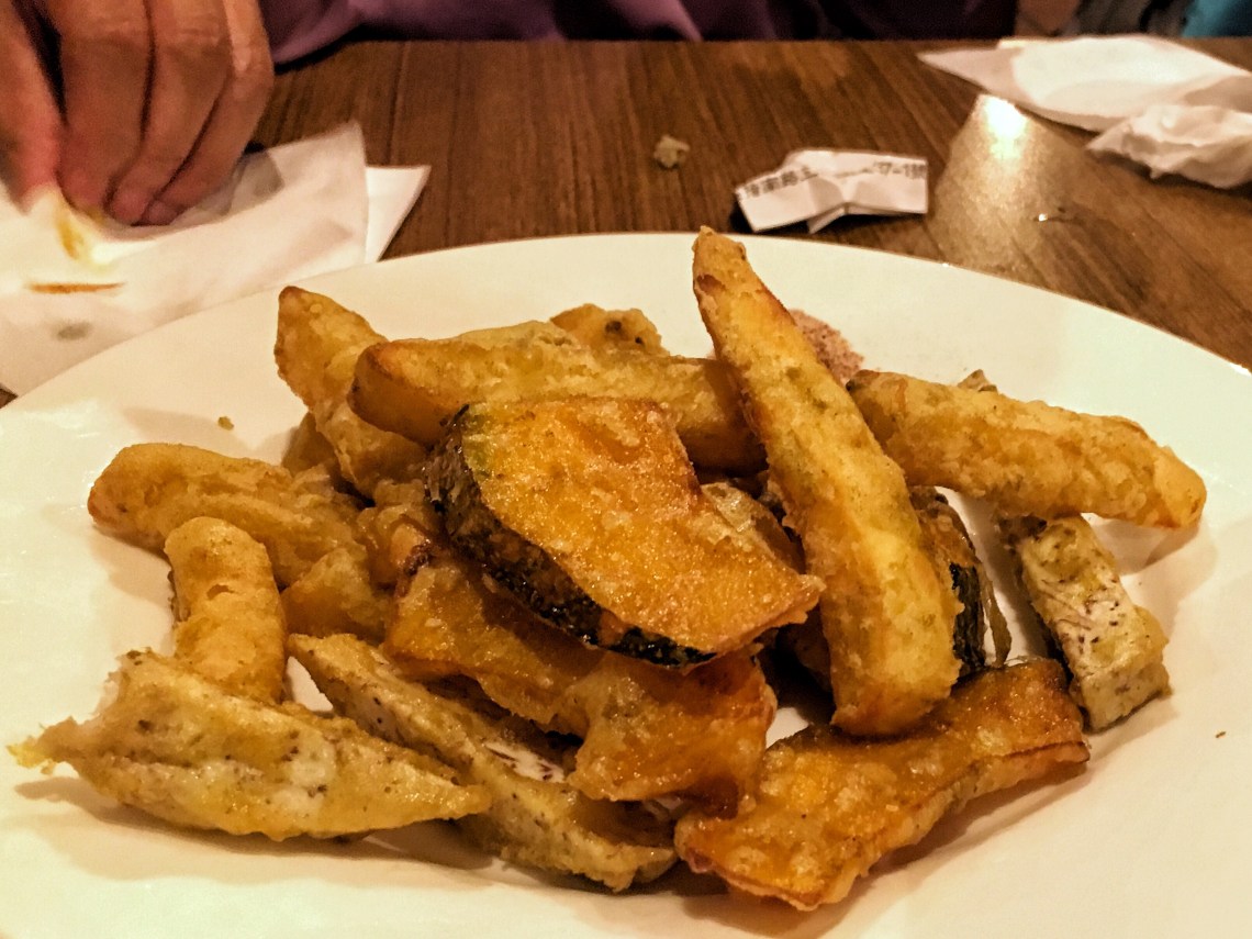 不只是炸物,而是每個細節都很完美的炸物!南瓜芋頭地瓜切片油炸,熱呼呼、鬆軟綿密的內裡被酥脆麵衣包裹,甚至也吃得出有茶香