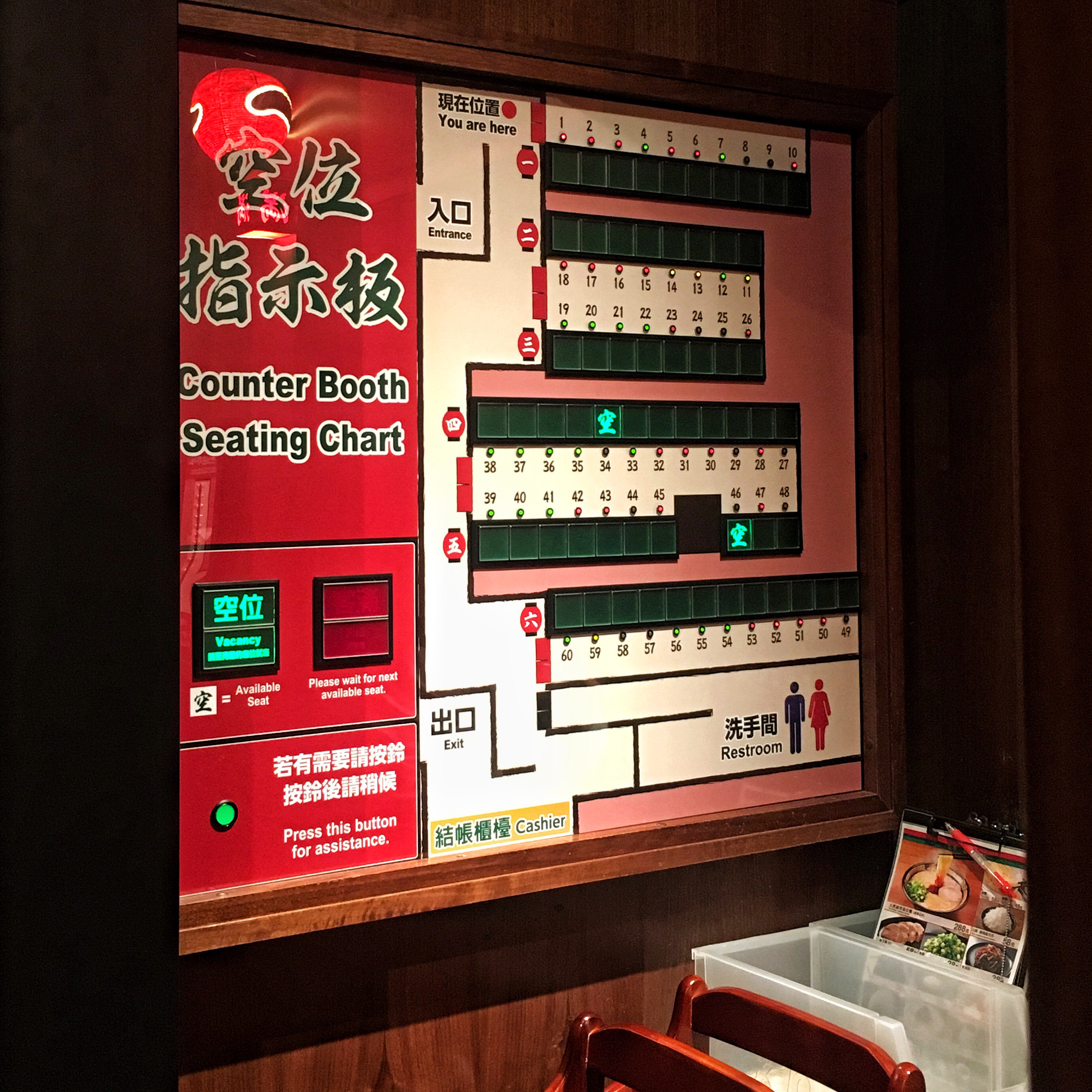 ▼ 空位指示版上亮著燈的就是空下來的位子