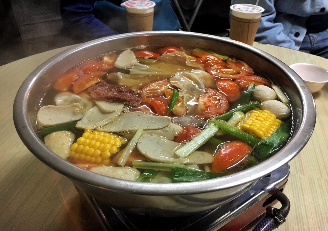 這天爸爸很興奮的揪了一大家子十個人來吃,早上還打了電話請老闆備好一點的肉,從大家坐定後過了半個小時終於端上看起來充滿湯頭食材的火鍋底料,食材部分沒什麼特別,湯頭則清甜不膩,喝多也不會有喉頭乾澀之感