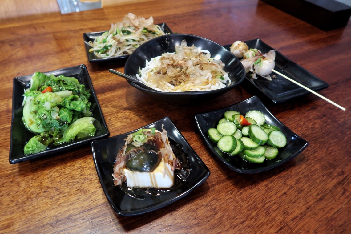 小菜部分都有一定的水準,沒有特別之處卻也不會雷,重頭戲的米苔目淋了瘦肉臊之外,出乎意料的是上頭的滿滿柴魚片,麵條(?)本身Q彈不過鹹