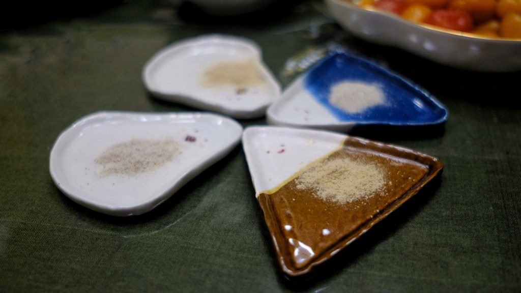 沾上不同口味的鹽是有趣的吃法,連裝鹽的碟子也這麼可愛~