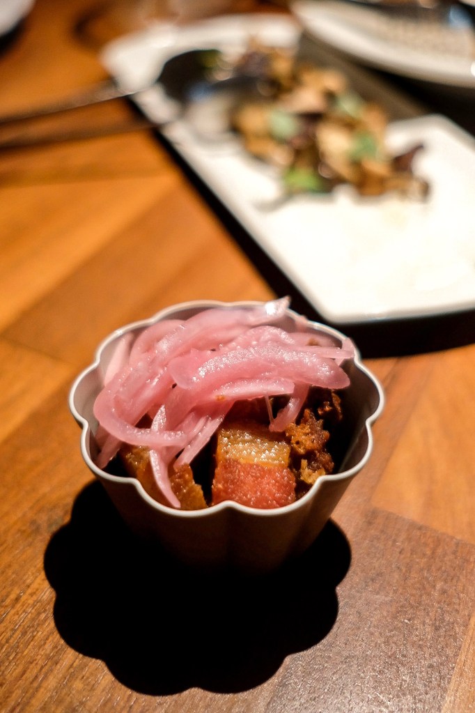 中間的醋醃蔬菜超級酸,怕膩的人可以搭著豬尾入口
