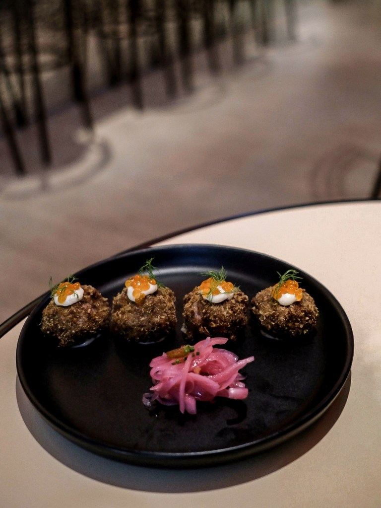 香氣十足的牛小排絞肉炸成丸子,中心還有點生,脆脆的炸皮上點綴奶油乳酪和鮭魚卵