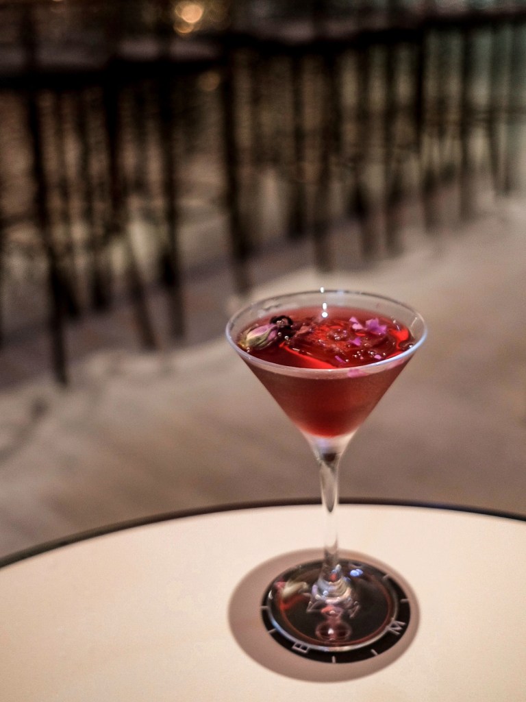 這杯是以琴酒為基底的比較酒的酒(好菜鳥的形容),玫瑰香氣濃,沿著杯緣啜飲的時候,嘴唇輕輕碰到漂浮著的玫瑰花瓣