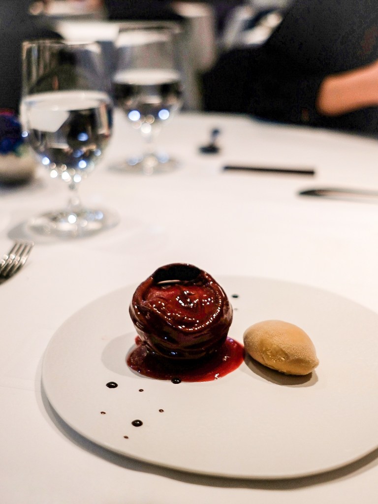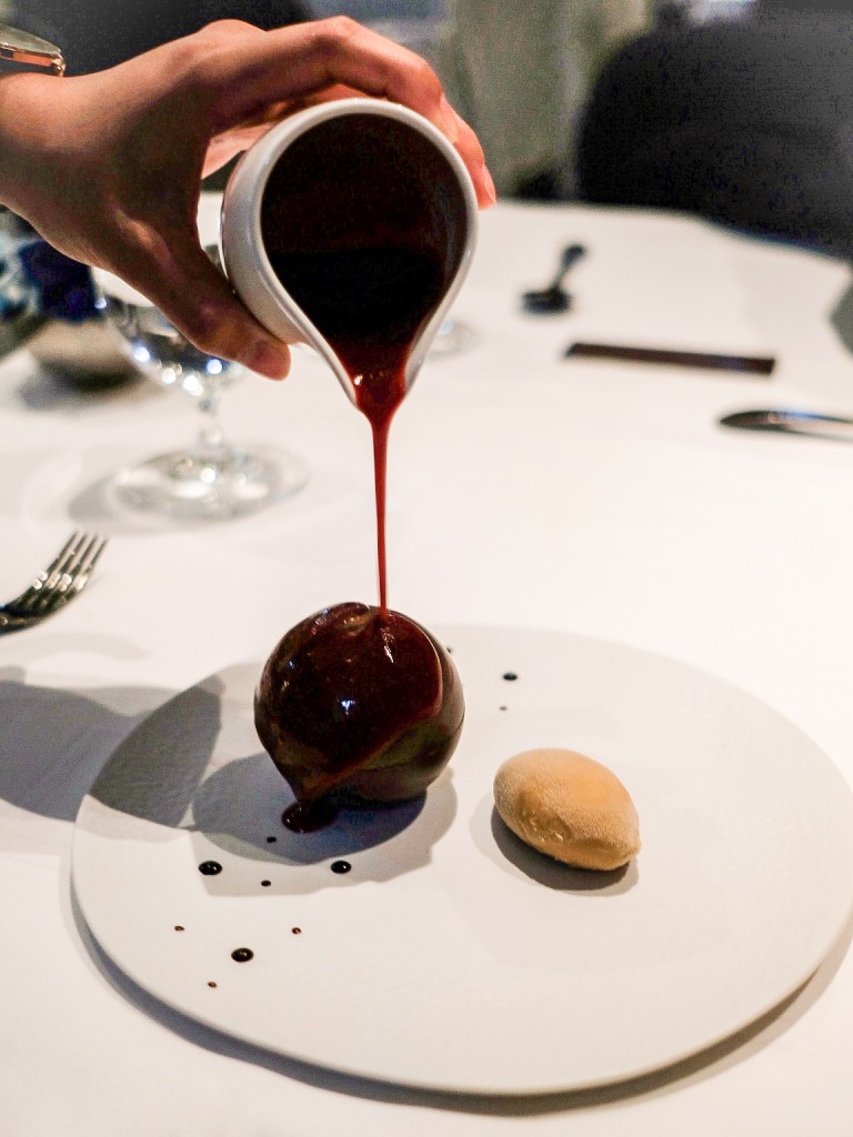 球狀的苦黑巧克力外殼,中心是白乳酪和輕柔的檸檬蛋糕,上桌後現場淋上熱的野莓醬,有巧克力和乳酪蛋糕的濃郁也有莓類的清爽,層次豐富又好吃