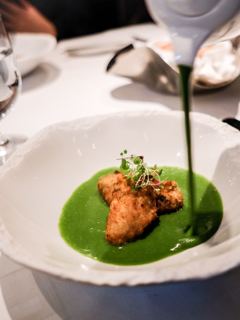 可能因為沒有吃過水田芥,所以覺得這道濃湯是今天很驚豔的料理,外皮酥脆又超肥美的炸生蠔倒上沒有菜腥味的綠色蔬菜濃湯,意想不到的非常搭調