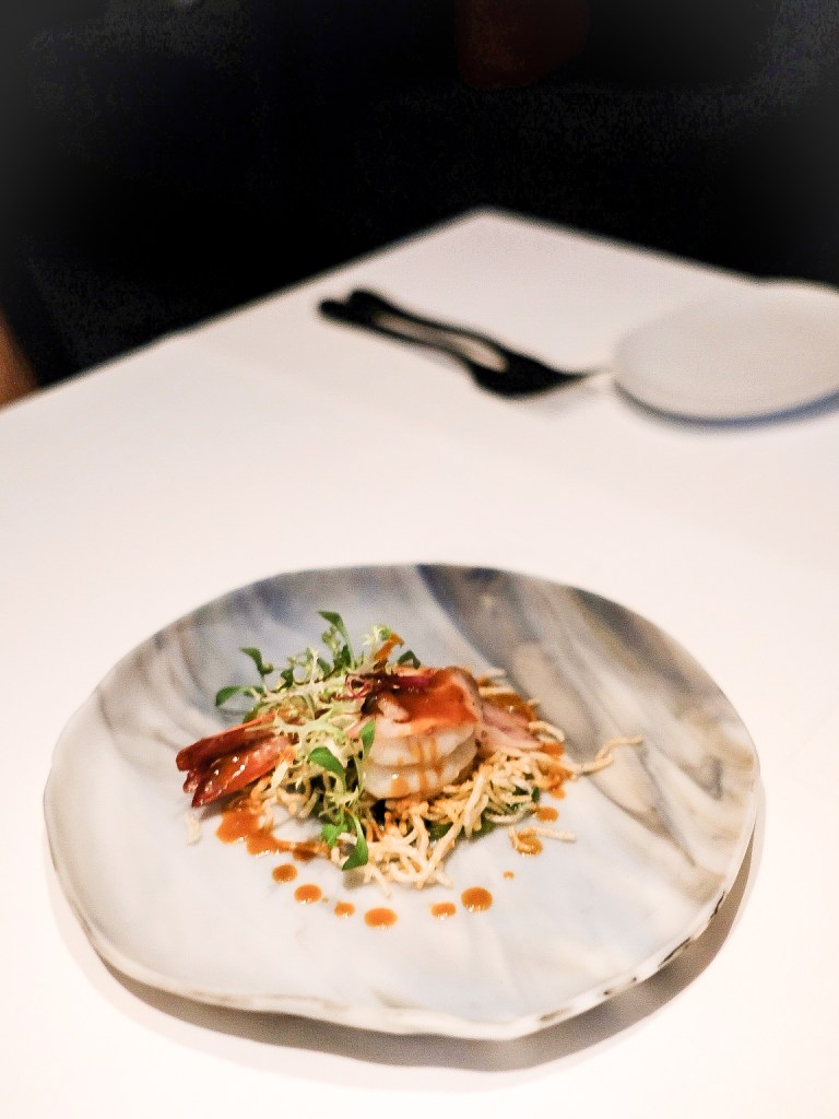 煎香的大干貝擺在青蔥與香菜泡泡和紫洋芋脆片,像插花作品這麼美,不過底下的咖哩醬汁味道很強烈,如果換成更能嚐到干貝原味的食材更好