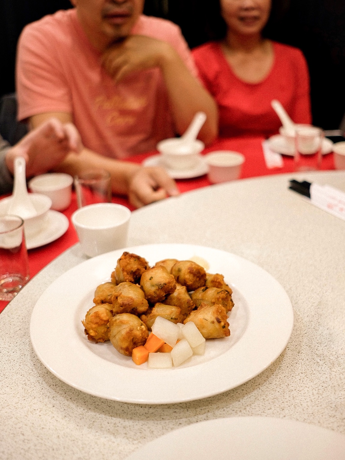 蝦棗據傳是蝦卷的前身,把鮮蝦、豬肉、荸薺等食材用豬腸膜包覆,再下鍋油炸,吃來油香帶脆,配台式醃蘿蔔更添清爽
