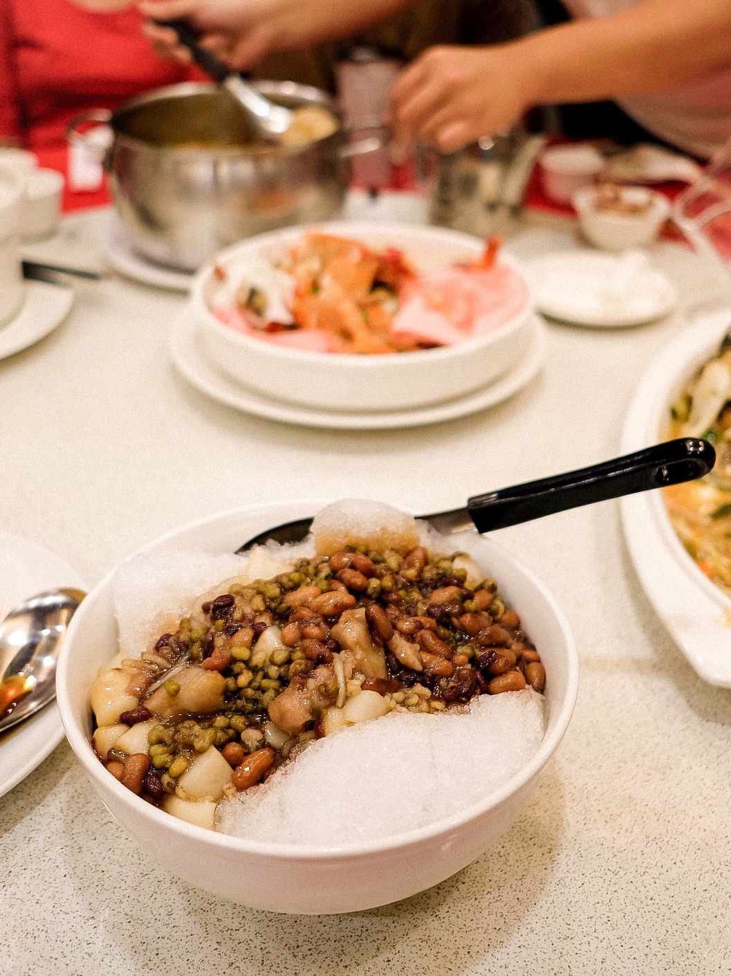 甜點除了布丁還有一大碗剉冰,裡頭完全不敷衍的放了紅豆、綠豆、大豆、圓仔、粉條和蜜芋頭,作為飯後點心非常清爽