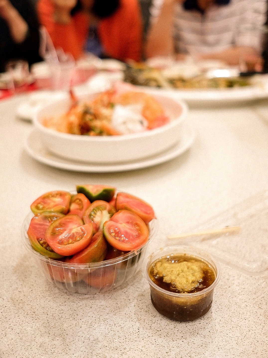 很特別的是包蜜餞的必須是小番茄,而沾薑泥醬油膏的必須是大顆的黑柿蕃茄,才能吃到最正確(?)的風味