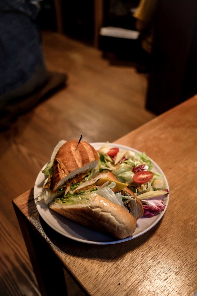 烤得外酥內軟不過硬的麵包夾入滿滿香料香的燉菜、新鮮生菜和起司片,意外的溫暖美味,一旁的沙拉與醬汁味道也調得滿好