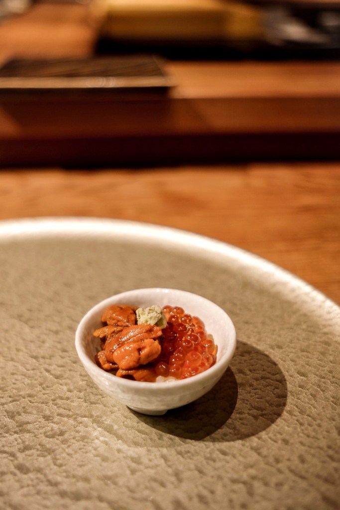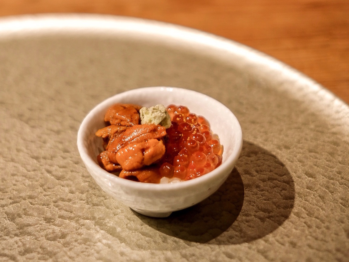 師傅特別提到使用較不成熟的鮭魚卵,外層的薄膜口感較明顯能增添口感,醃漬的鹹度適中,赤海膽奶香而甜