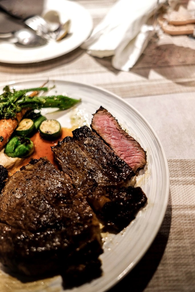 肋眼牛排煎烤得很香,切面熟度也很美不過咬起來稍硬;很喜歡烤得香香脆脆的蔬菜與有點像馬鈴薯泥卻味道更特別的菱角泥,別具心裁的配菜選擇超級優秀!