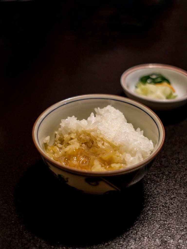肉盤和菜盤上桌之後由穿著和服的服務員進行桌邊服務,先涮一片肉片讓我們沾蛋液吃,再繼續涮其他蔬菜豆腐等配菜,我覺得入口即化的牛肉片和配菜的口味都很棒,配上晶瑩剔透的日本米超級療癒,是會讓人懷念的味道