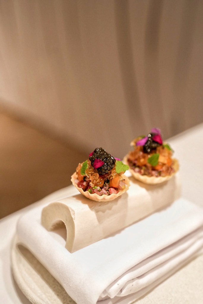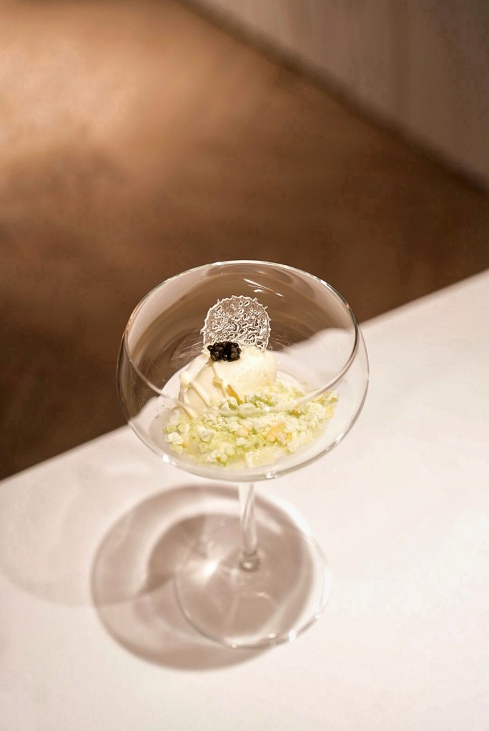 為橄欖油冰淇淋、柚子雲朵、糖片和魚子醬的組合