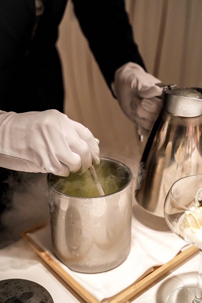 最後桌邊放上液態氮低溫攪拌成的黃瓜雪霜