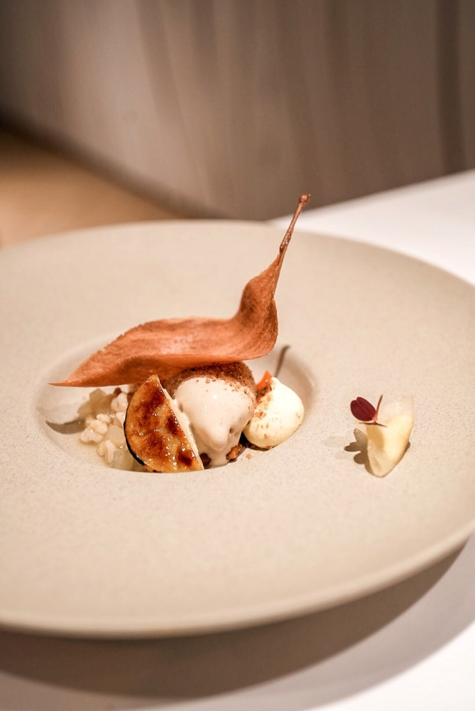 一旁還有燉煮水梨和柑橘奶油包成的餃子盤飾