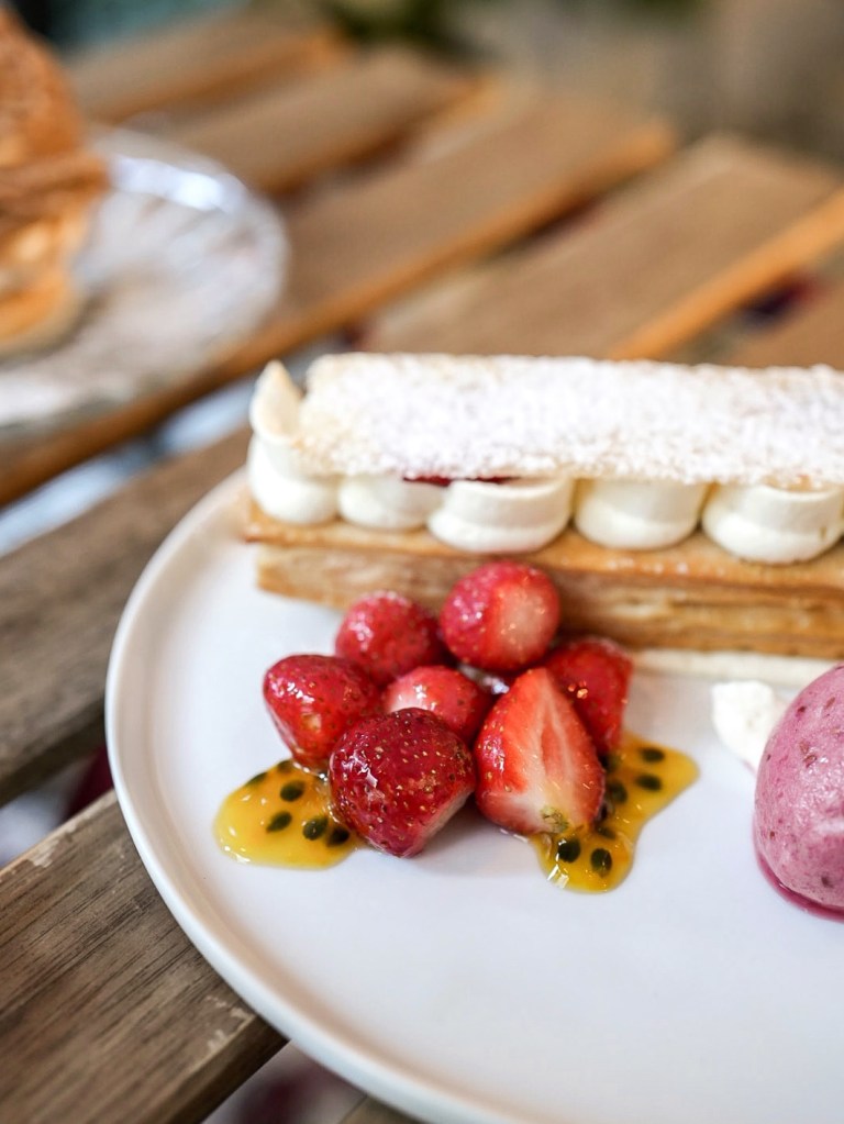 搭配相對清爽的百香果漬草莓和覆盆莓雪酪