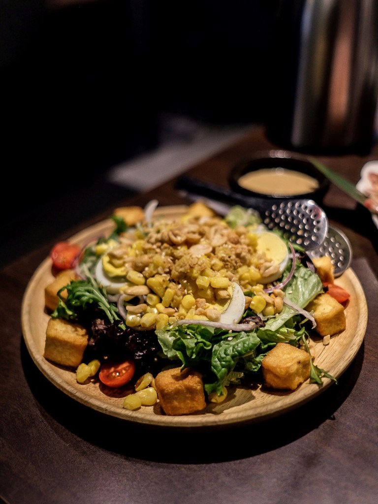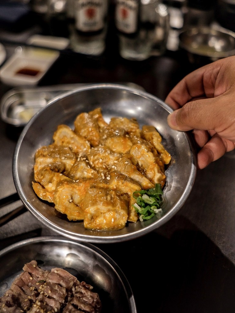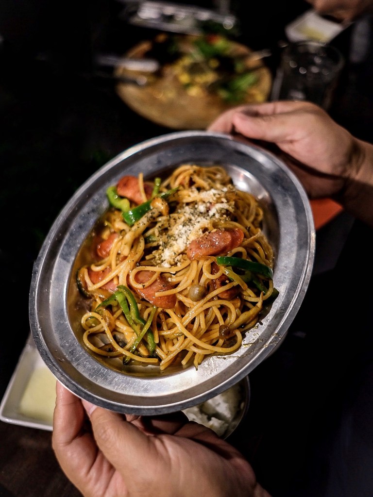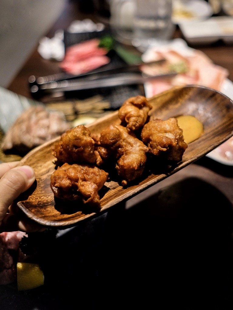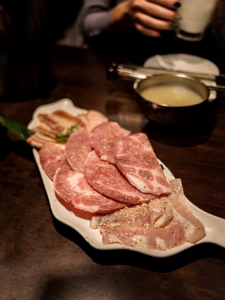 因為自己不是單純的肉品愛好者,所以更喜歡的是主食和配菜,第一次來的時候覺得加了柴魚和美乃滋的日式炒麵讓人念念不忘,這次則是蠻喜歡多汁的唐揚雞、配料豐富的芝麻豆腐沙拉、Q彈的白米飯,以及第一次吃到的拿坡里義大利麵;肉品部分,這天隨性點的就屬特選椒鹽牛五花和伊比利豬肋條最符合自己的喜好