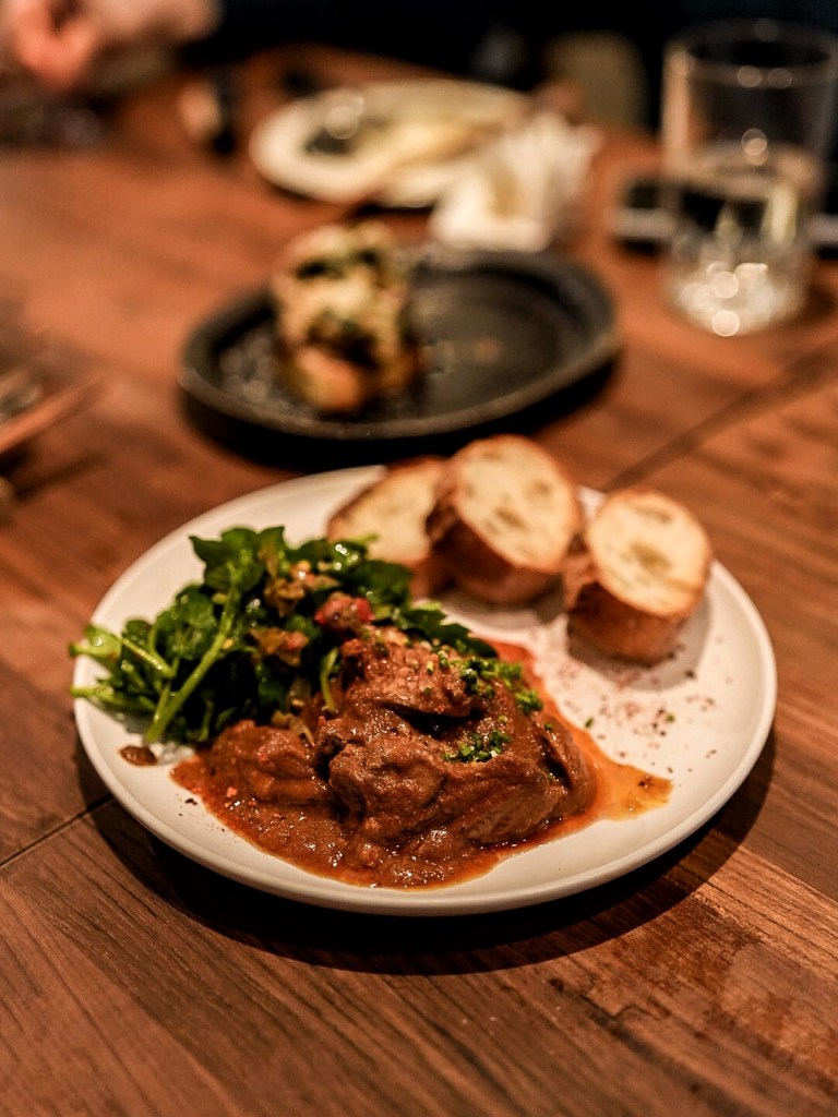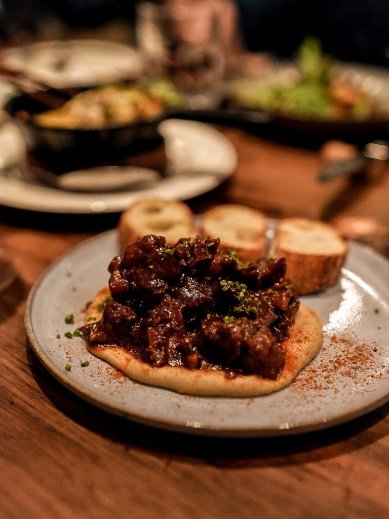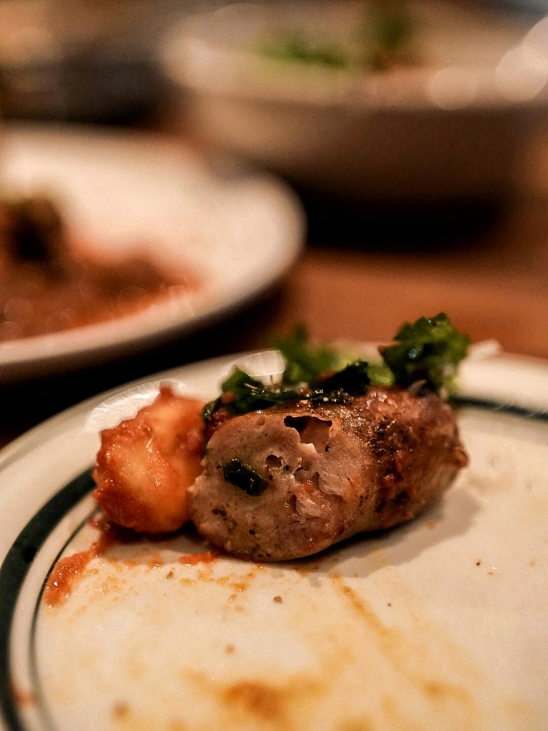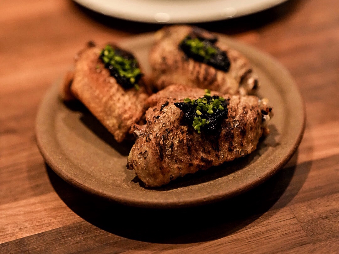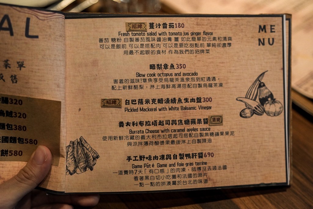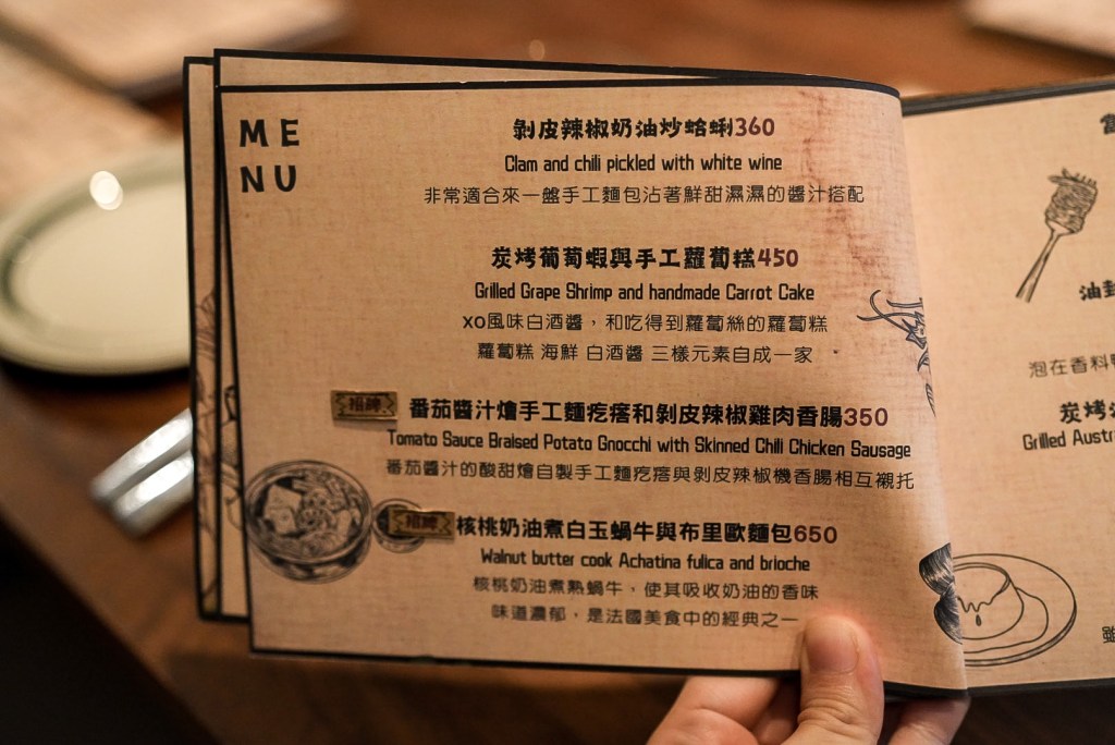 這天點的每一道都喜歡,也都是平時比較少吃到的風味組合,當中私心認為必須吃吃看的有鮮美的醋漬鯖魚生肉盤、中西兼備且暖心的芋頭蚵仔烘蛋、外脆內多汁的炭烤土雞翅、完美發揮食材美味的炭烤蓮藕與焦化培根、創意十足的燉牛舌與牛舌餅,還有療癒的手工麵疙瘩佐自製剝皮辣椒雞肉香腸