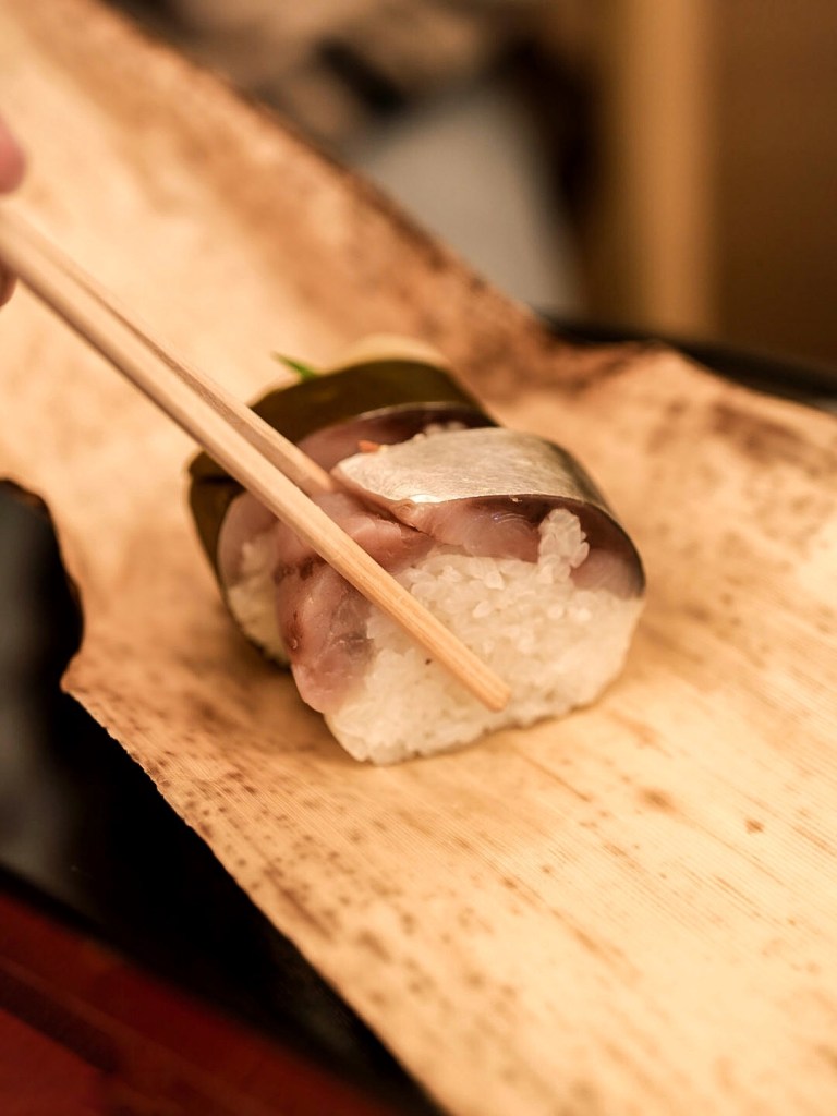 鯖魚棒壽司是京都府很具代表性的壽司種類,通常在長方條木盒裡填上一層飯,再放上醋醃過的鯖魚,後來由於壽司要從北海道送到不靠海的京都,於是再發展成多加了一層薄昆布的松前壽司;雖然吃過的棒壽司很少,但能感受到いづ重的鯖魚棒壽司十分肥美,油脂恰如其分的貼在醋飯上,一起吃的家人們都蠻喜歡的
