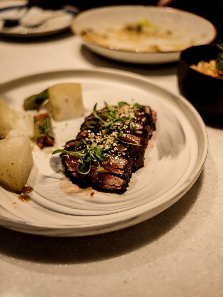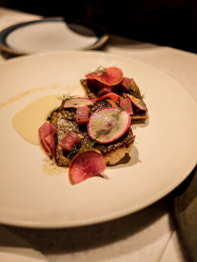 店裡音樂開得比較大聲,有桌位也有吧台座位;這天四個人點了五道前菜、兩道主菜、兩道甜點份量蠻剛好,整體擺盤漂亮、味道不錯,但口味比較重的關係覺得一定要點蔬菜或多人分食才不會感到太有負擔