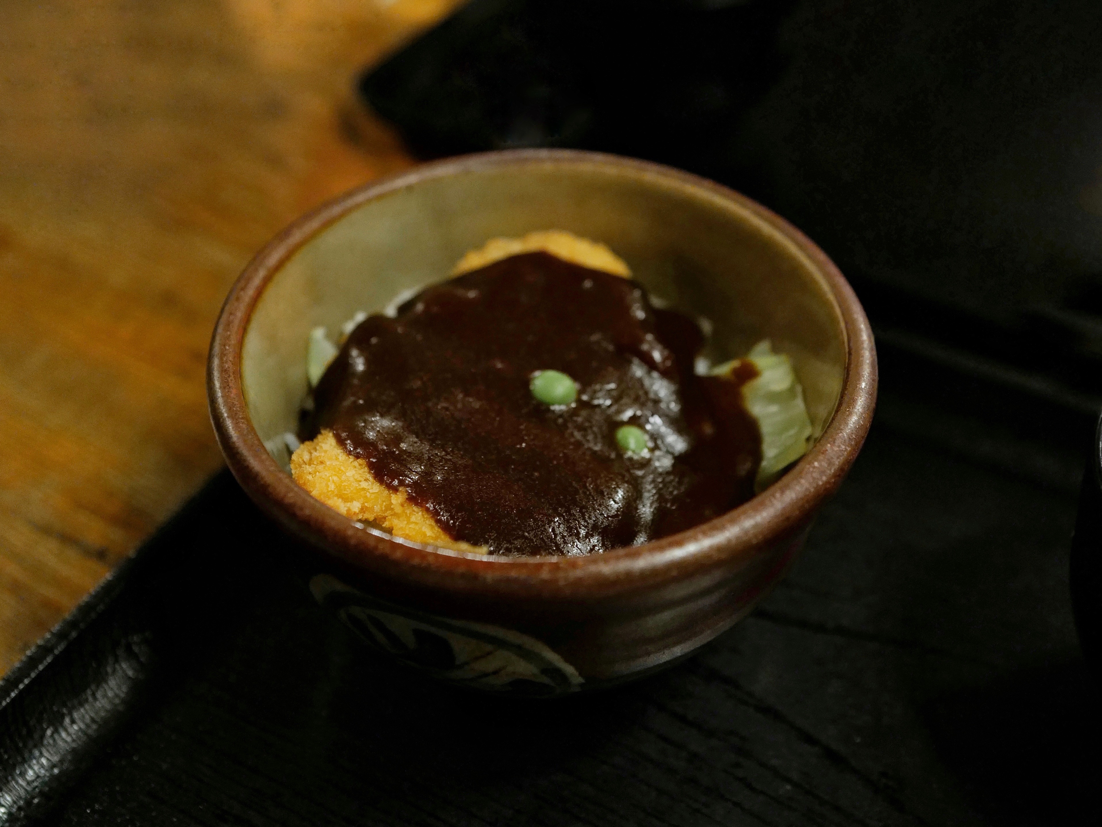 有點西式風味的牛肉醬汁豬排丼飯醬汁很濃,單吃偏鹹,配底下少許高麗菜和白飯還算剛好,尤其熱騰騰的白飯軟硬適中,帶點醬汁吃起來很療癒;滑蛋則是常見以洋蔥、味醂調味的作法,對台灣人來說比較安全牌,而豬排的厚度和麵衣都像是台式便當店那種薄炸豬排