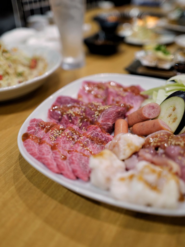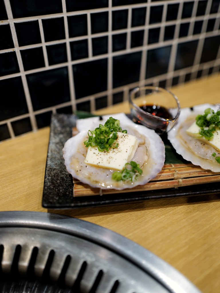 四個人點了兩杯飲料、一份沙拉、兩份牛舌、兩份特選和牛拼盤、一份綜合拼盤、一份奶油扇貝和兩碗白飯,吃完以後認為少點綜合拼盤是比較剛好的份量,和牛選用九州地區為主的鹿兒島、佐賀、福岡等地和牛肉,不算超級細緻但油花密佈、入口即化香氣重,而且同等級的肉比台灣價格低很多,吃完還是感到很幸福的❤️