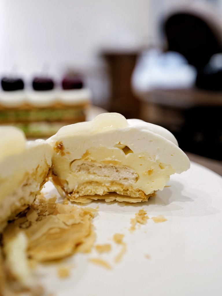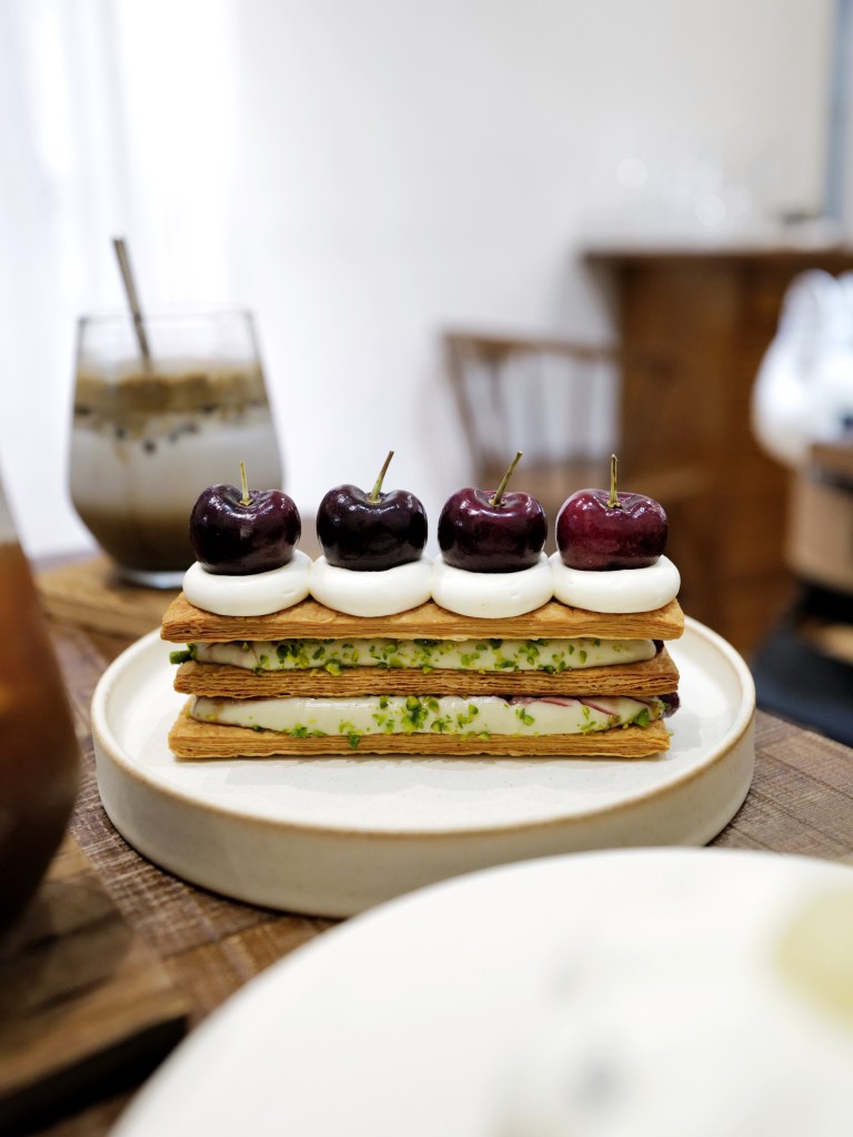 檸檬千層的內餡是檸檬奶餡、柚子香緹、檸檬果醬的混合,吃起來很像有柚子提味、奶味多一點的檸檬塔,對我來說甜度稍高但風味融合得很不錯;櫻桃開心果千層則用了新鮮櫻桃、開心果香緹、自製酸櫻桃果醬,櫻桃香氣很棒,不過對我來說甜度可以再高一些,如果也是開心果愛好者的話可能會覺得開心果風味不夠濃郁,不知道是不是糖量不夠的關係?