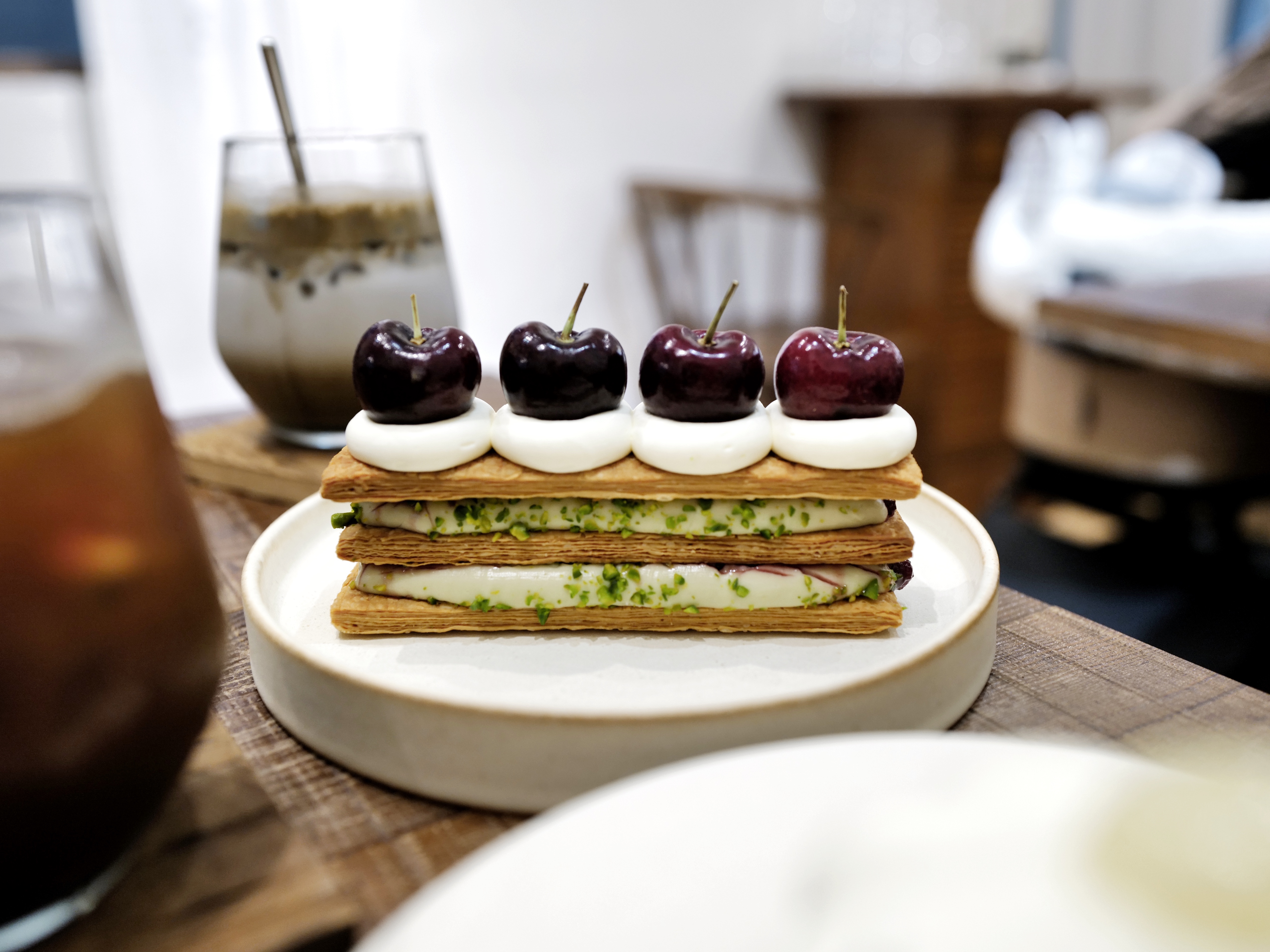店裡空間小但明亮優雅,桌距近,用餐時間限90分鐘,低消是每人一杯飲品和一份甜點;原先衝著整顆水蜜桃的千層而來,沒想到今天是過季停售的第一天!於是改點檸檬千層和新品櫻桃開心果千層