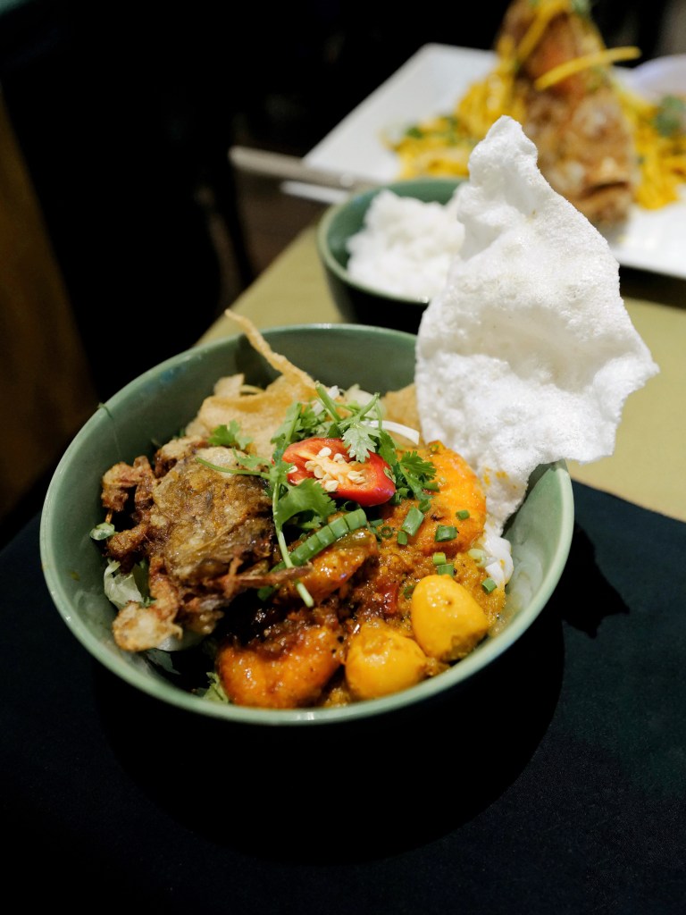 Q彈近似米苔目的麵條放上炸豬皮、豬肉