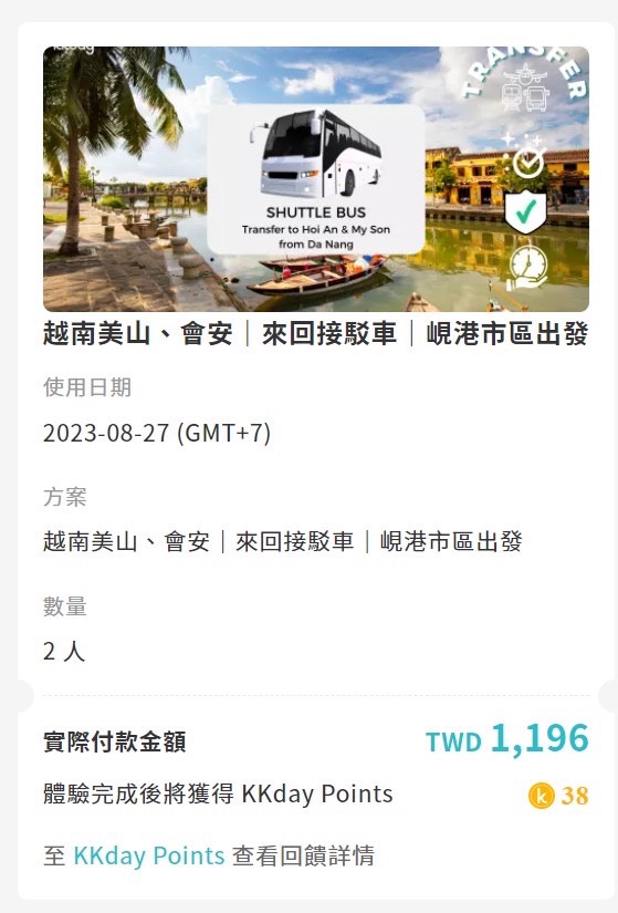 透過KKDay預訂了峴港👉🏼美山聖地👉🏼會安👉🏼峴港的接駁車,直接到我們住的飯店接駁,價錢包含美山聖地門票、無須再付小費,不過每一段都是共乘、不同台車,一定要跟接洽的窗口保持聯繫並且上車前確認好車次及集合時間