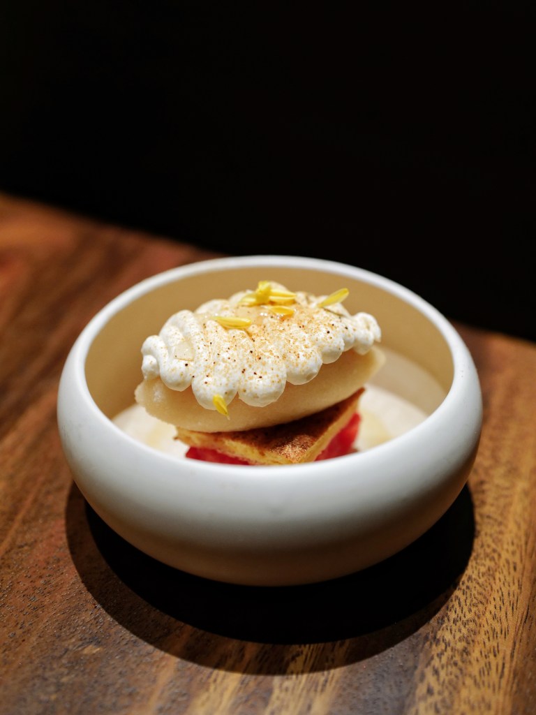 其他印象最深刻的是味道組合新奇也好吃的兩道甜點,蜜桃雪酪西瓜提拉米蘇作為前甜點特別清爽,主甜點的無花果紅豆奶油竹炭泡芙香甜而奶味適中