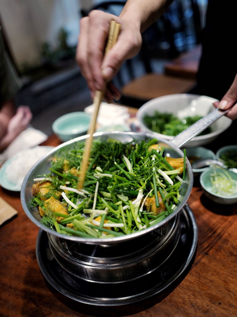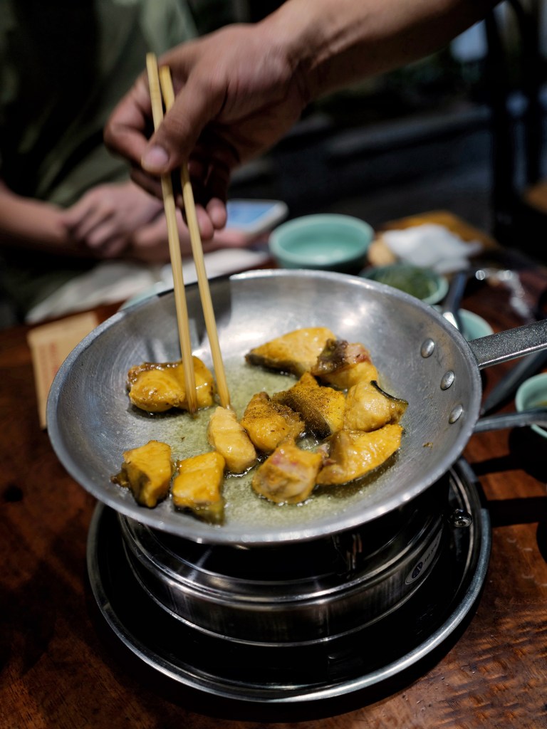 原以為在地美食不出河粉、越南法國麵包,沒想到還有香料炒炸鯰魚鍋!餐廳只賣一種餐點、以人頭計價,主要是薑黃醃的炸鯰魚在鍋裡與青蔥、蒔蘿現炒,再配米線、香菜、魚露、花生、辣椒等一起享用,特別而且味道好,套餐內還有包含炸春捲