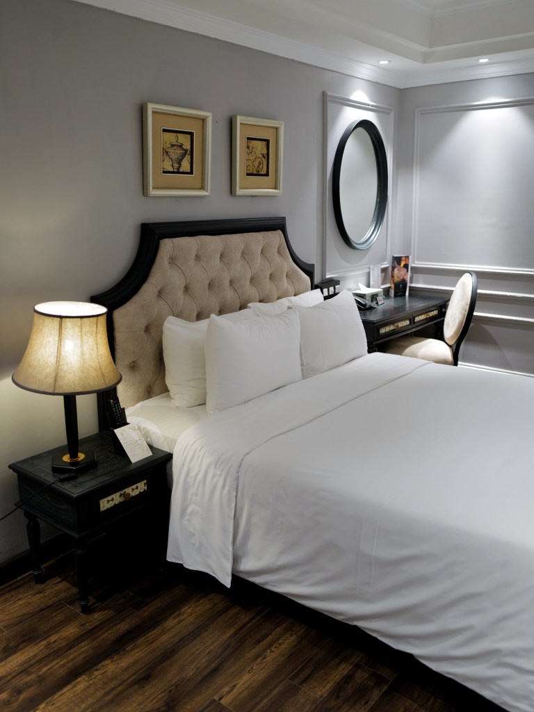 考量小吃店密度的話,河內住宿首選還劍湖周邊的老城區,在Booking.com篩選到這間飯店地點很棒、價格合理、員工非常親切熱心、裝潢算是有美感的黑白法式殖民風格,不過從鬆脫的插座可以感覺建築偏老舊、早餐乏善可陳,整體不差,但因為插座的緣故有機會會想試其他飯店