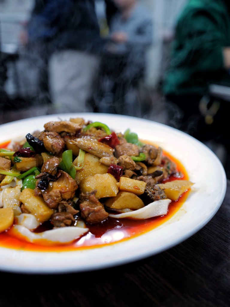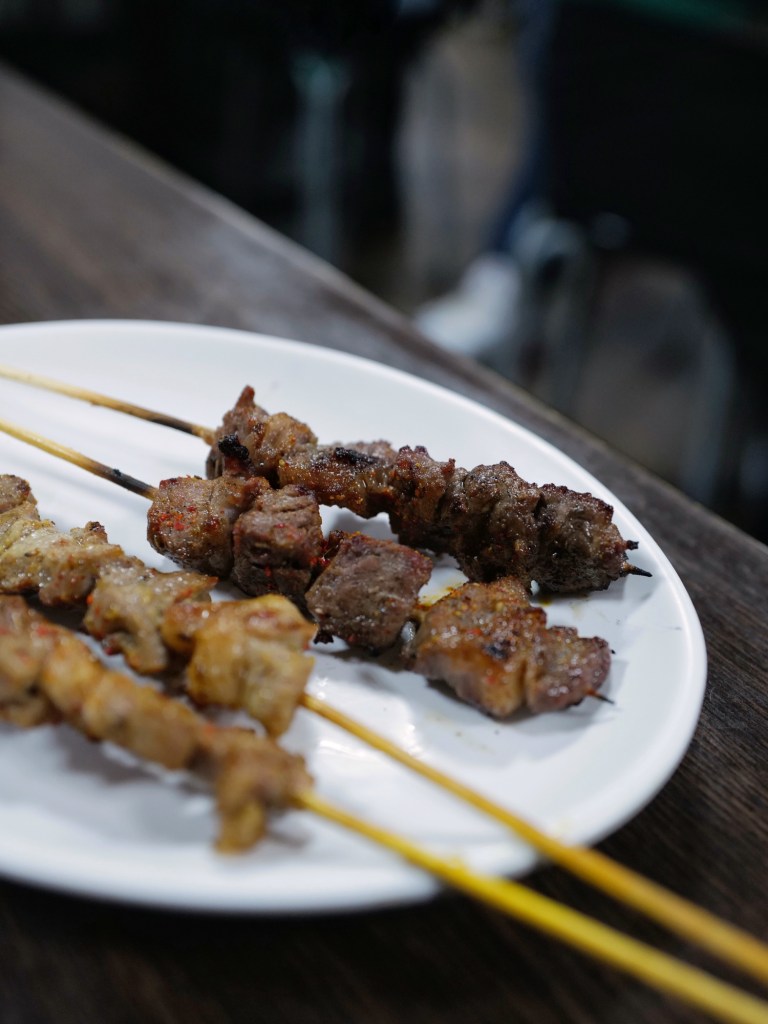 店裡空間不小,座位仍然全滿,環境不是很明亮乾淨那種,但遇到的外場服務人員態度蠻親切;兩個人點了一份炸甜不辣、數串肉串、半隻大盤雞,其實已經超過食量但就是想點這些嘛(任性)除了牛肉串還好以外,其他菜都蠻喜歡的,尤其大盤雞裡的手工拉麵Q彈有勁、對澱粉控來說十分療癒!不過口味非常重,推薦自行攜帶加很多冰塊的手搖杯來解膩