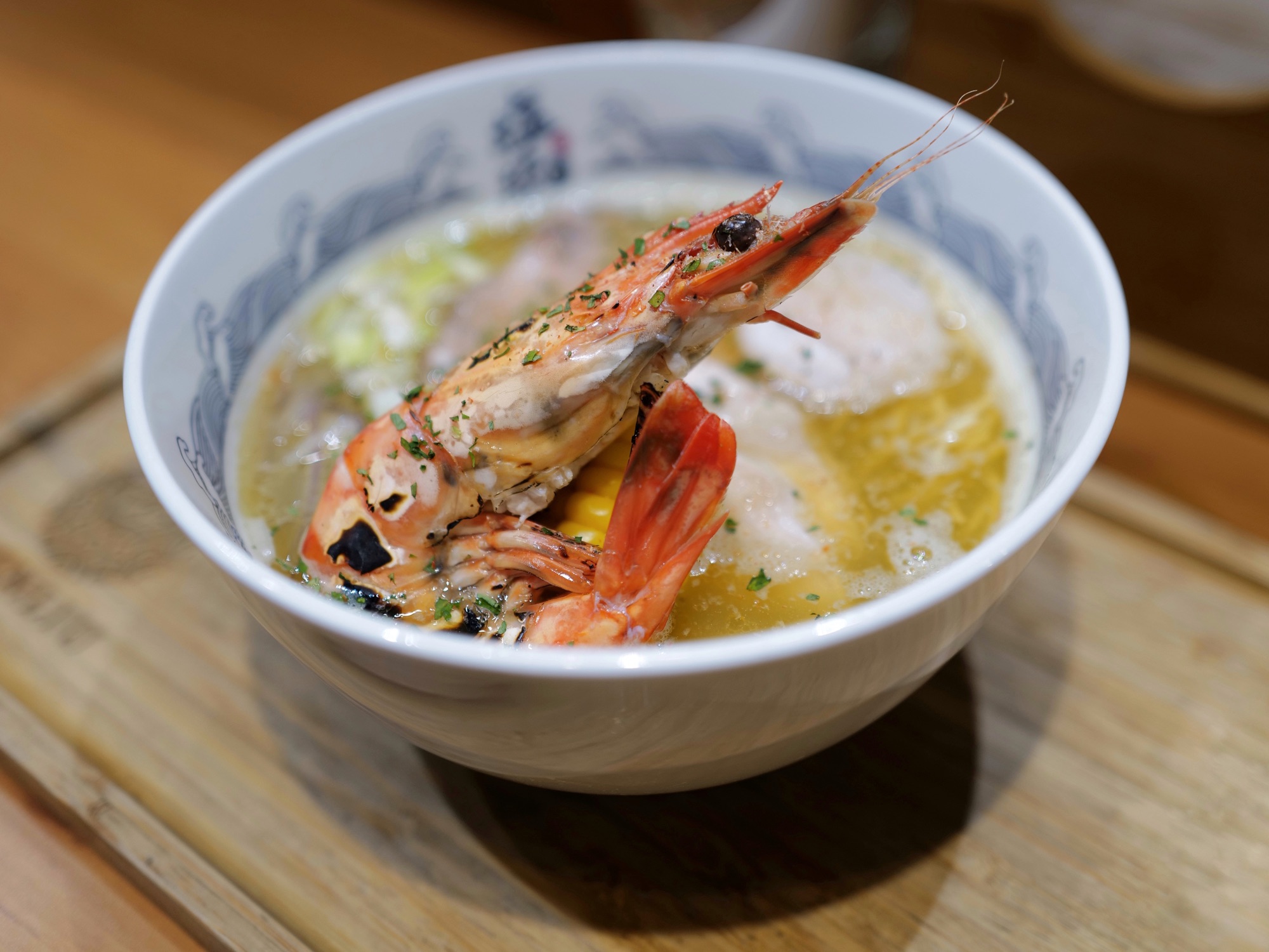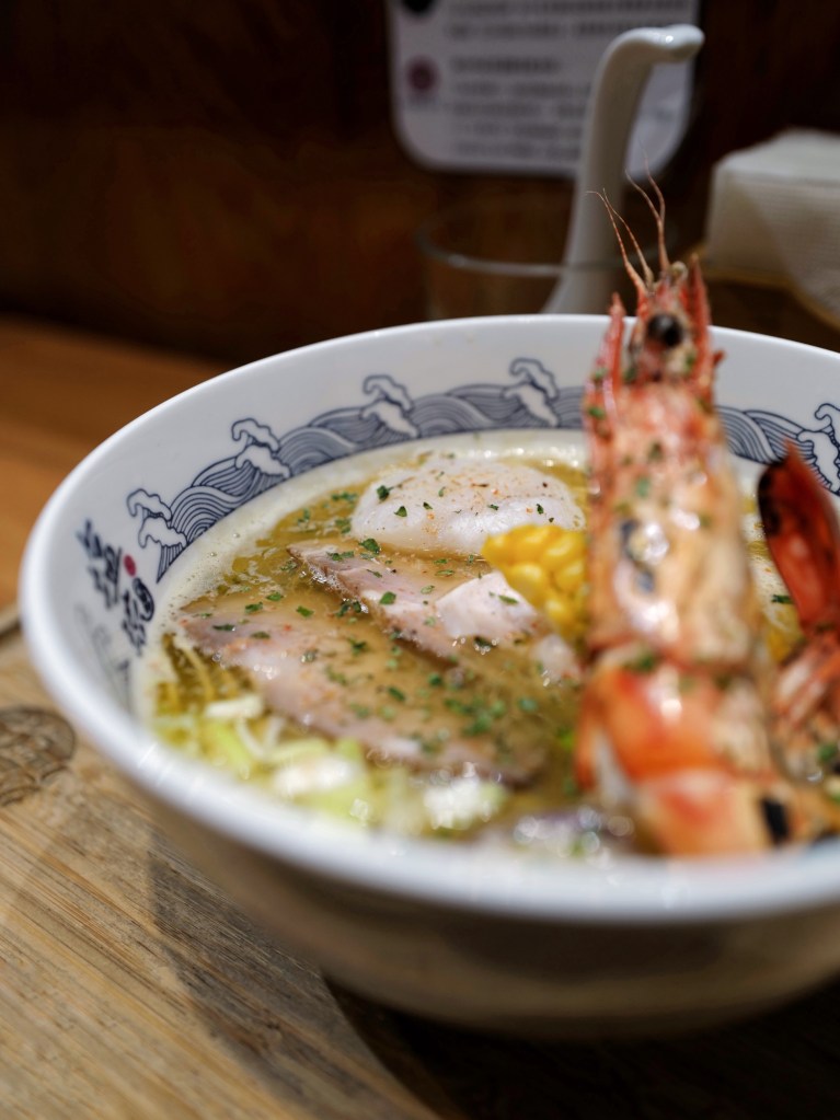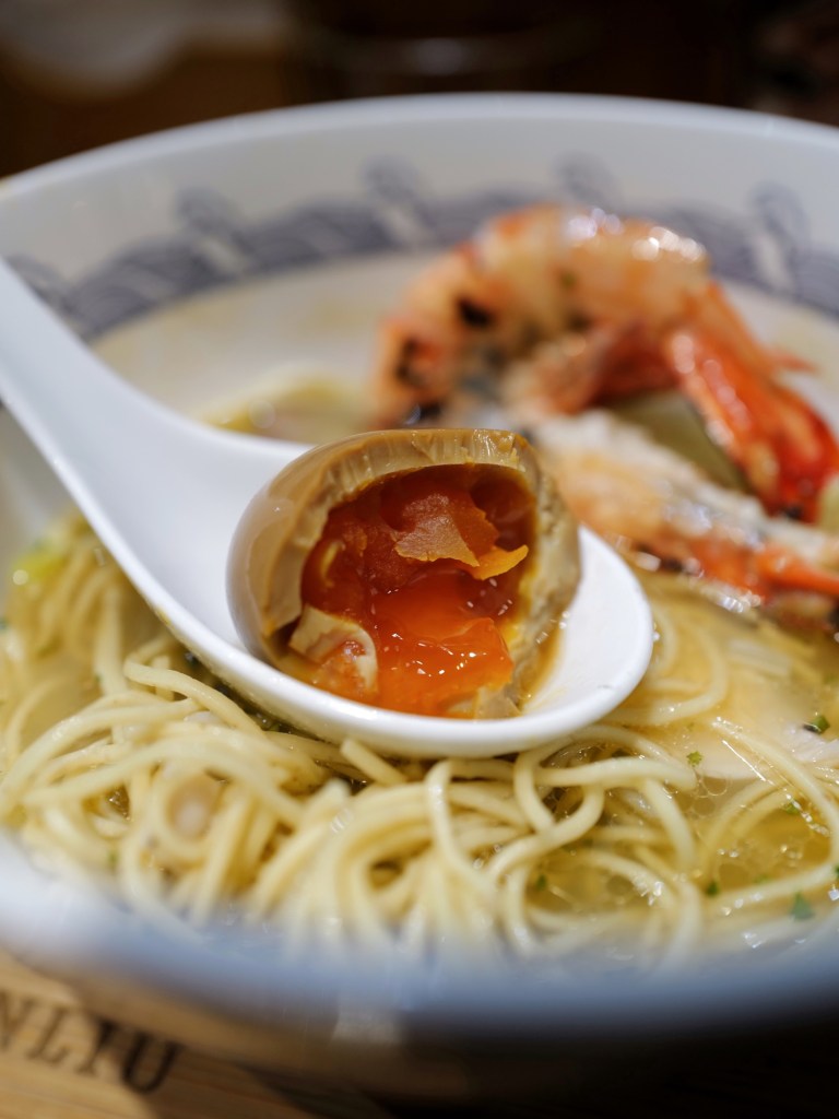 為了慶祝年末(巧立名目👍🏻),點了菜單上看起來最豪華的SP大蝦干貝龍蝦清湯拉麵、SP干貝濃湯拉麵和一顆溏心蛋,都是正常鹹度+九州全粒粉硬麵,湯頭的海味非常足、麵體細卻不失麥香,溏心蛋也很入味有層次,以一介拉麵外行人的角度吃得相當滿足