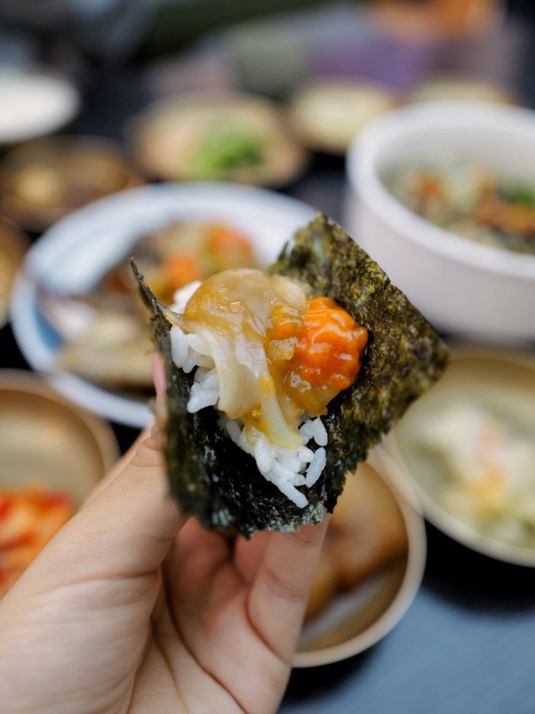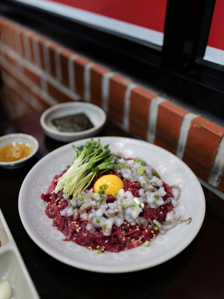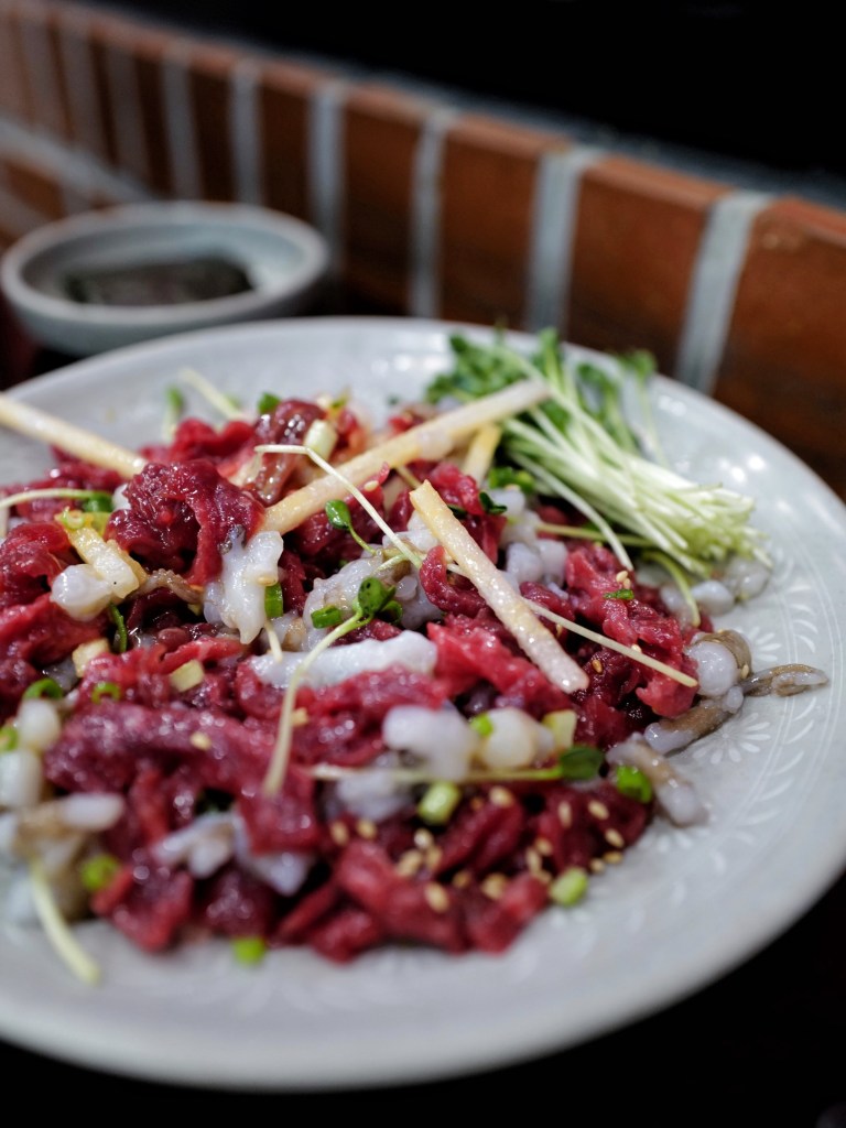 點了醬蟹和醬蟹拌飯,醬蟹吃起來有點像冰冰冷冷、更腥更鹹的海膽,不難吃但不至於回味無窮;醬蟹拌飯因為加有蔬菜和麻油,口味更有層次一些,是平常願意當正餐的料理,下次還要吃醬蟹的話會想試試其他家